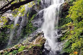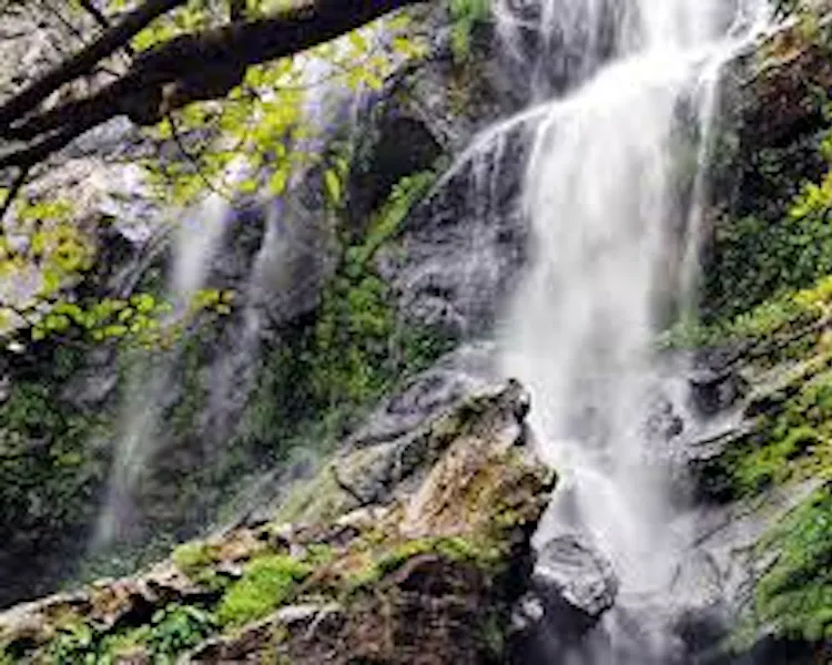 Rainforest cascades tumbling over broad rocks into a pool, with adjacent areas for camping.